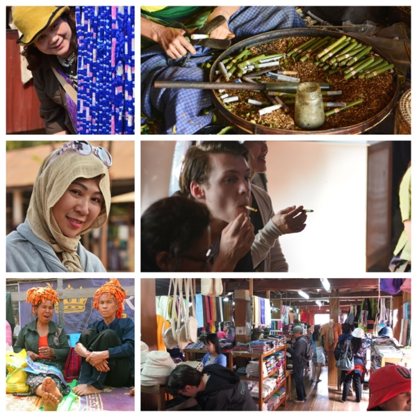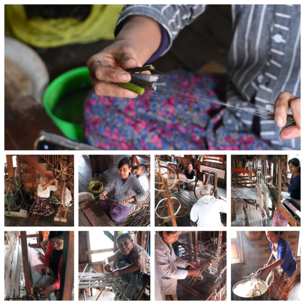 經過長程在湖面上飆速,我承受著寒冷的湖風,來到第一個村落,一間一間的木屋,裡面有著極傳統的木梭織布,多為上年紀的婦女在操作,後來在一處地上驚奇的看到,一女將荷花莖梗折斷拉開,取得莖絲,搓揉捲成Lotus絲,據說這種布料的發明源自於一名虔誠的佛教徒為了表現他的誠心,於是利用蓮花梗抽出的絲線,為佛像編織一件袈裟,無意間創造了一種獨特的布料。參觀展售廳發現,Lotus布圍巾織品產量極少價格極貴,一條小圍巾US$120,但有位女畫家先生購買,事後使用清晨騎自行車,說天然的非常保暖;再其次是Lotus Silk,有兩種柔滑的混紡面料:84%的蓮花和16%的真絲,具有透氣性;55%的蓮花和45%的絲綢,輕盈而柔軟。這些環保面料是輕便時尚夾克和連衣裙的理想選擇。最後才是我們常見高級棉布Cotton,手工編織質感很好,相對便宜。