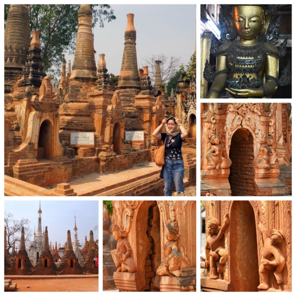 湖區最有名遺世的佛塔林區Shwe In Dein Pagpda(Inlay lake Inntain nyaung oak monastery茵萊湖茵泰良瑞橡樹寺廟),茵萊湖西南方漫長的運河河道,沿途會需經過很多處竹草水柵欄,以及一些磚陶橋或木橋,在湖面上還畫過一整片的布袋蓮,步行一段路徑,路面有人在賣烤餅,是用一堆鐵砂爆出來的蝦餅之類的米餅,新鮮但沒什口味。最後到達一條有屋頂的長廊通道,非常長的長廊,兩邊都是工藝品攤位,不少工藝品做工都非常不錯。佛塔林區據說最早一批佛塔,建於西元前273-232年左右蒲甘國王統治時期,Alaungsithu國王在此興建了第一座塔,此後貴族和富人紛紛效仿,漸漸形成今日龐大的塔林,這裡的佛塔林分佈面積非常的廣。由於緬甸一直有翻新佛塔和古跡的習俗,一座佛塔可能在歷史長河中,不斷被局部或整體翻新。在這些斑駁的佛塔林裡,有著多種不同時代的工藝和建築材質,我感覺部分有點像北非突尼西亞斐尼基人及羅馬的遺跡。