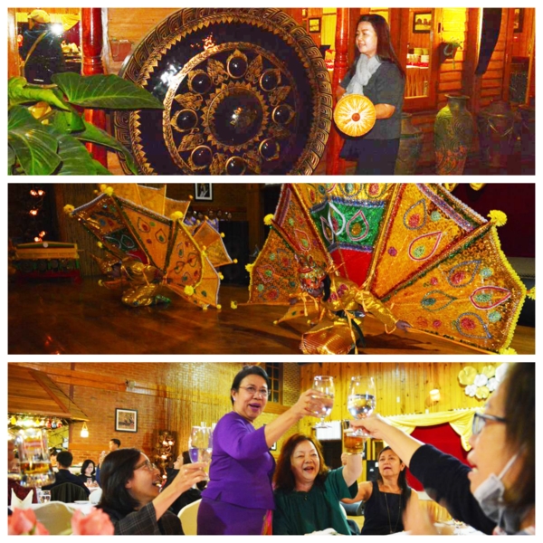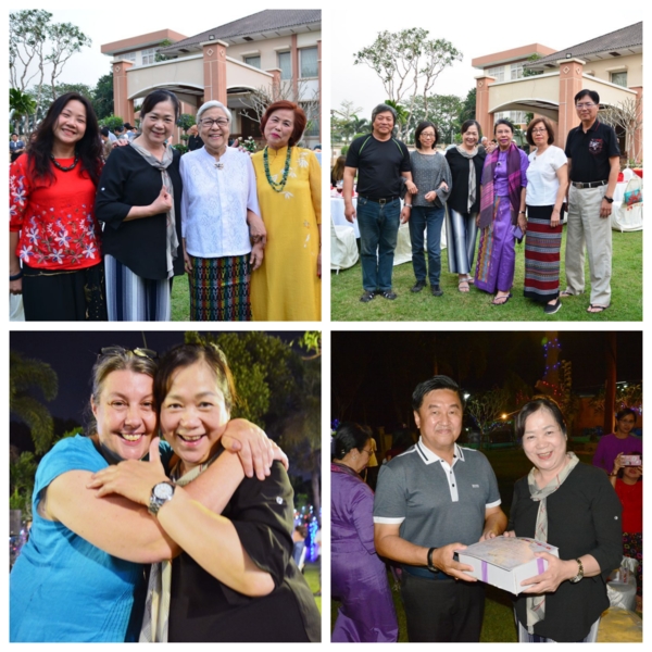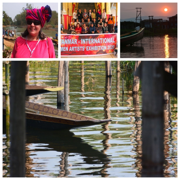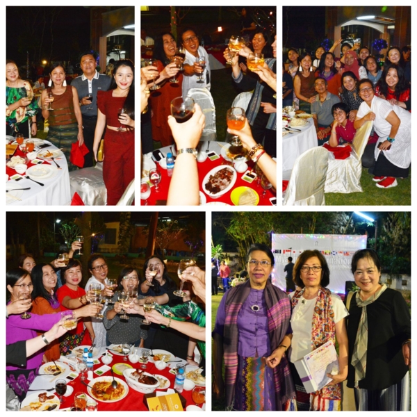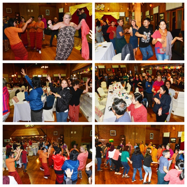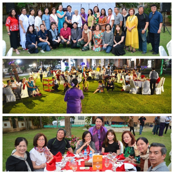 第八天2/29,四年一次的潤月,一早就各自集中行李到門口,國內線每人限重12公斤,再搭乘Bagan航空回去仰光,空姐服裝令人驚艷脫俗,還有一絕,這班飛機不對號,上機隨意坐。惜別晚會在一間政府豪華庭院世界遺產的花園舉行,政府官員、贊助廠商都有出席,宴席辦的有聲有色,還請了仰光有名的男女歌手助陣,有感情的歌聲繚繞,席前旁邊居然有一攤子,滷煮的一鍋豬肉脯、內臟、粉腸、豬頭皮等,切功一流,非常軟爛入味,比台港小吃有過之。這群女畫家,尖叫著她們自己的語言,瘋言瘋語的又唱又跳,有三位更跳上舞台展現她們專業的歌喉,各國家都有代表上台感謝,每個英語表達能力與內容都一流,感人肺腑豪不含糊,真佩服她們,我們台灣的代表是吳美月畫家,非常辛苦出力協調參加工作,一切更感謝緬甸會長及服務人員,盡心盡力的安排。