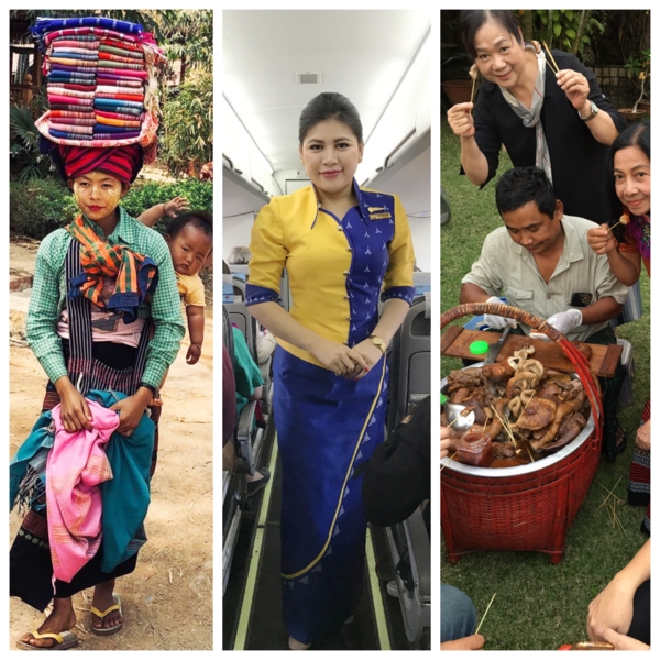 左邊是緬甸鄉村勞動婦女的民族妝扮,中間是國內航班空姐的服裝,設計得太有型了,真美!