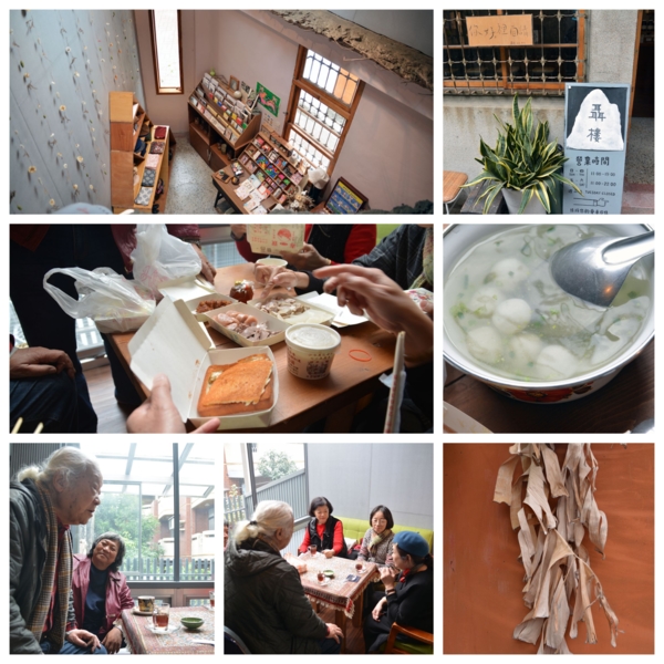 接著回市內,居然帶我們去他們兒媳開的迷你小咖啡室屋,喝手工咖啡,香醇可口,咖啡室非常窄小卻設計古樸可愛,室小何需大有仙則名,卻深受年輕人喜愛,兼營手作小飾品,很是有味道。午餐在此外小鄭外帶到台南一定要吃的名產棺材板、榮盛米糕及阿財點心黑白切,我很小到台南旅遊一定來「沙卡里巴」,是日文「盛場」(SAKARIBA)的音譯,意指熱鬧市集,日治時期許多台灣小吃攤集中於此,當時店家林立,十分熱鬧。焦師母在台南長大,卻不曾吃過棺材板,炸得剛好的棺材板吃起來真是太酥脆了,尤其是皮的部分相當好吃,內餡也不簡單,除了有炒香過後的麵粉、牛奶和高湯一起勾芡外,還要放入雞胗、花枝、洋蔥、豌豆、紅蘿蔔當配料,一個小小棺材板,卻有大大的內涵,體驗小時候的味道,現在沙卡里巴現址已改稱為康樂市場,以前我好吃鼎邊銼,清魷魚、台南羊肉湯(當時我覺得比岡山羊肉湯還棒)。