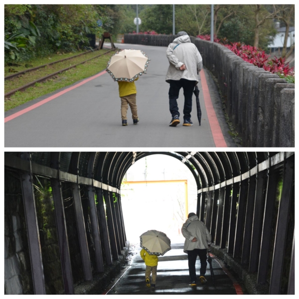 鄭老爺陪著孫子出遊,走在路上穿過舊鐵道山洞,畫面甚是感人