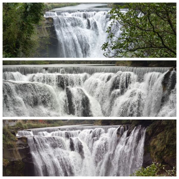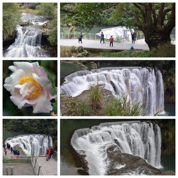 10:40我們遊覽車往十分瀑布出發,一車旅客配合度超好,大部分中老年人集合準時,導遊一路解說有趣詳實又不囉嗦。依稀記得40多年前,在中華彩色印刷工廠上班,參加員工旅遊到十分瀑布,當時還十分原始,由剛進入職場青澀的青年,如今已較老人了,舊地重遊。地處基隆河上游瀑布群,十分瀑布落差高度約20公尺、寬度約40公尺,壯麗的水瀑、磅礡的氣勢,為臺灣最大的簾幕式瀑布,比烏來瀑布好看多了,十分原來的意思指就是「十份」,就是指有十戶人家合作無間在這裡興建家園,有「臺灣尼加拉瀑布」的美譽。以前的泥巴路,現在都築成觀光的平坦水泥路,還設置階段的觀景台,可以由好幾個角度觀賞。沿路還盛開著茶花,增添少許春意。