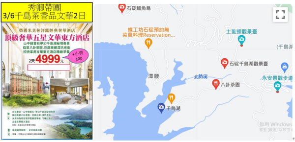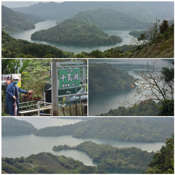 秀卿駕輕就熟,我們34位客人坐40人大巴士,輕鬆介紹並休息,走高架環快約30分鐘到北宜公路半路,換乘9人座小巴去千島湖。原來千島湖是翡翠水庫上游集水區,所形成的潭灣與山巒,為管制區,此地為他們世代私人土地,不能下去遊玩,欣賞角度非常,店家提供觀光客餐食,其中滷豆干好入味,東方美人茶葉蛋太好吃了、奶油花生好香,桂花蜜茶很可口,伴手禮八卦茶園產製的包種茶、東方美人茶數度獲獎,價錢公道。老闆司機兼解說員親切,我才獲知有景點:
