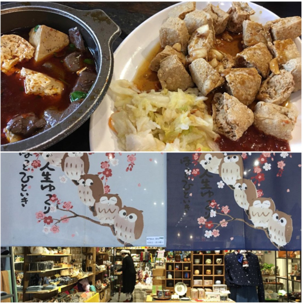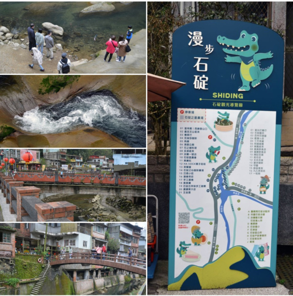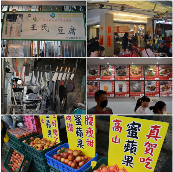 接著開到不遠的石碇,老街是石碇地區最早發展的區域,早期以製造及買賣大菁、茶葉為主,房屋以當地石頭為主要建材所建築石頭屋;東街傳說則是乞丐的聚集住所,素有乞丐寮之稱。這裡的百年豆腐店王氏豆腐,越南籍人員還提供越南春捲,我們點了紅燒豆腐,炸臭豆腐都很好吃,與深坑比起來,小家碧玉尤有風韻,特殊的吊腳樓建築以及不見天街,老街裡的百年老鐵舖,都是遊客必到的景點。以前為運輸茶葉的輕便道路,沿街多半為土桷厝建築,當時熱鬧富裕的象徵,目前石碇國小前的集順廟廣場,則是當年茶葉批發的集散場所,可惜現在深坑人山人海,石碇要經營稍微困難些。