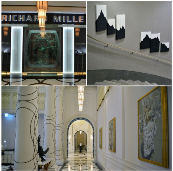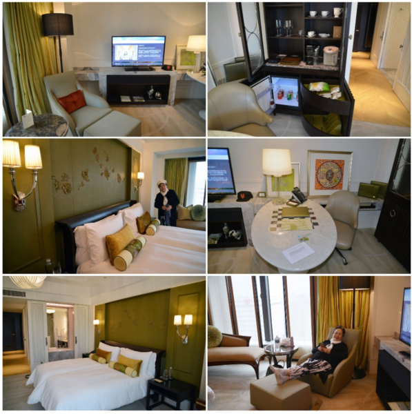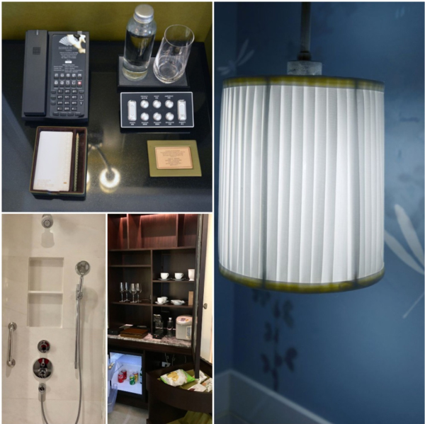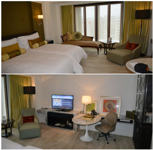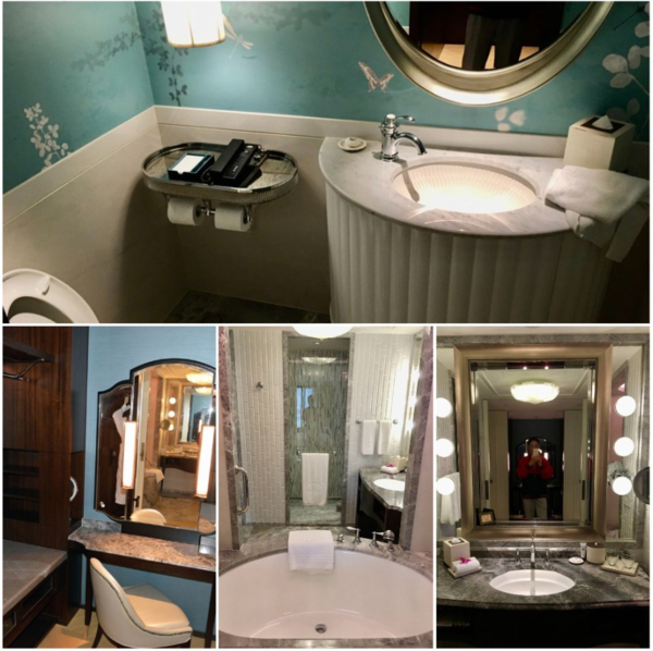 我們全部在十二樓,一進房間門口有個玄關,黑色布置牆面掛了一幅精緻小畫,感覺不一樣,進來右側是化妝間,洗手台及燈光牆面非常舒服,空間夠大,唯一沒有免治馬桶,再進有一衣櫃空間及放行李的地方,厚棉睡衣品質高,女士化妝台不占浴室空間。左側是衛浴空間,明亮的衛浴空間,乾溼分離,大理石的質感,浴缸品質舒服,還附一罐高級沐浴鹽,冷熱噴頭都恰到好處。主洗臉盆及設施均佳,照明很好,但浴室有三四個開關較複雜,晚上洗頭洗澡時,一開始不習慣幾種出水開關,有手拿 、有淋雨頭、塗抹浴皂液洗髮液單獨的淋雨頭,出水很舒服。幾種洗浴料均掛牆上使用,未如預料如杜拜給高檔可攜走的瓶罐。