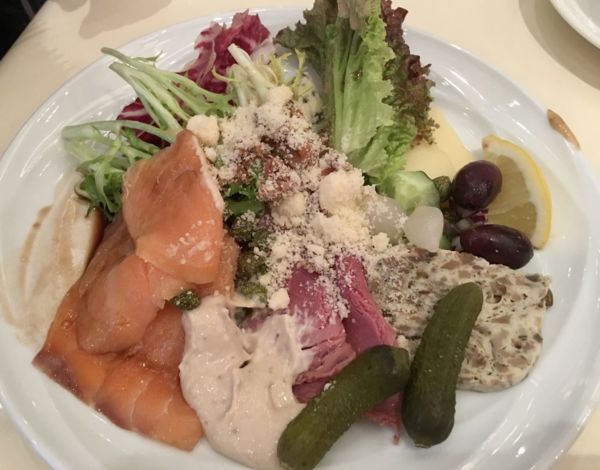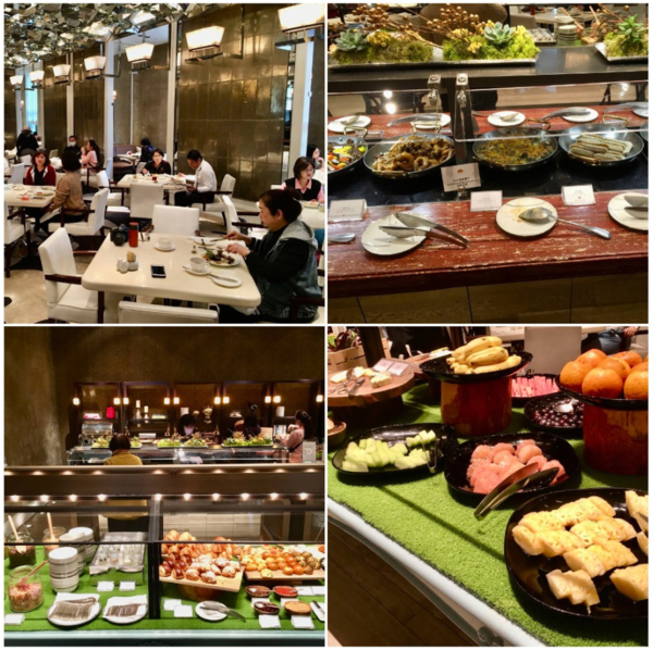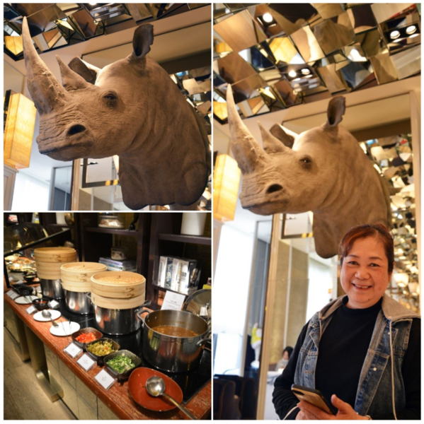 入住的房客早餐都可以在五樓的Cafe Un Deux Trois 法式酒館享用,我們提早0800用早餐,已經有一些客人在用了,大家都是來輕鬆慢慢地享受的。我們剛好坐在廳內真犀牛頭的地標下,原來吃過這的同學牛叔承夫婦,也在這留影過。菜色樣式雖然不很多,不過都走精緻風格,我們現在年紀已不是在吃夠本,而是體驗高級,品嘗上流社會的享受,對我而言經歷過就好了。