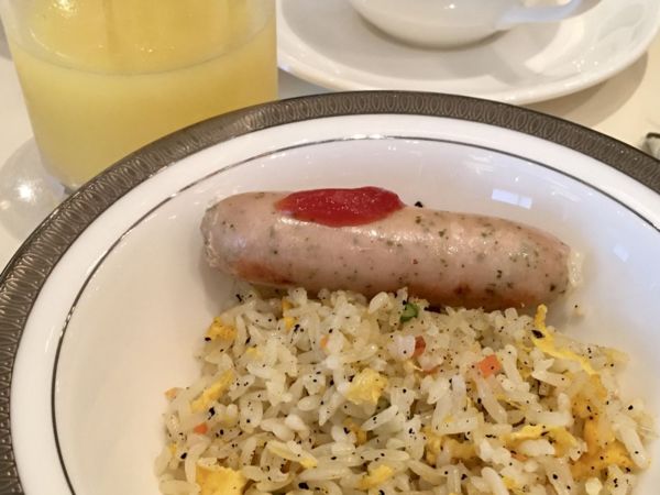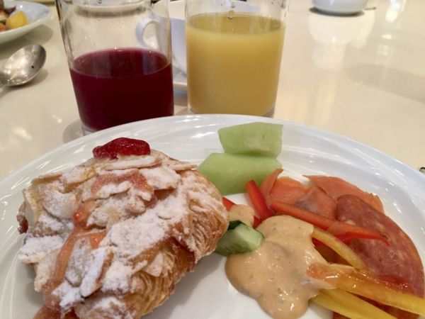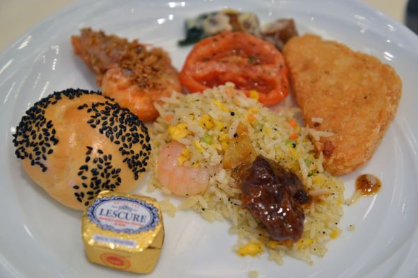 杏仁可頌相當酥脆,口味真的很香,淡淡的甜味一點都沒有膩人的奶油味,我另外搭配精緻的水果片及高檔起司片,很滿足。水果鮮甜、新鮮燻鮭魚片、歐式燻牛肉片,再搭水果片,飲著香濃柳橙汁及蘋果汁,點了紅茶、熱豆漿,選了大三角薯餅、烤蕃茄、各式生菜沙拉、醃黃瓜、醃橄欖,取了鹽焗蝦、雞肉香腸、乾香炒飯、燒餅夾肉,還拿了碗東方牛肉麵,可能好比牛爸爸上千元的牛肉麵了,最後再拿了松露小麵包加一壺清茶,雖然沒吃荷包蛋、中式稀飯,也沒有壽司等,實在吃到撐了,相信午餐都免了。服務人員超親切有禮,拿走已用餐盤,而且不斷的補充茶與咖啡。