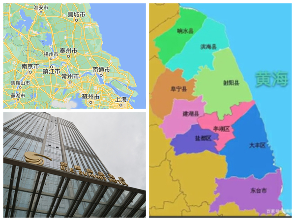 鹽城市,海岸線長582公里,南鄰南通市、泰州市,西界揚州市、淮安市,西北接連雲港市,東瀕黃海。地處長江三角洲北部,境內地勢平坦,河渠縱橫,全市總面積16,931平方公里,是江蘇省面積最大的地級市。東晉義熙七年(411年)改名鹽城,抗日戰爭後期,析東台縣北部設台北縣,另外台北縣因與台灣省台北縣重名,改名大豐縣;建陽縣與福建省建陽縣重名,改名建湖縣;鹽東縣與阜東縣調整為射陽縣與濱海縣,我們團裡有位趙雨青小姐就是濱海縣嫁到台灣的。台灣名人有好幾位:行政院長郝柏村及台北縣長周錫瑋就是鹽城人,我還看到郝柏村的墨寶題匾呢。