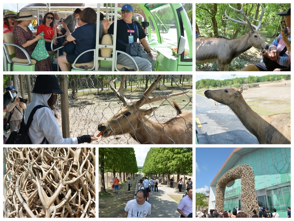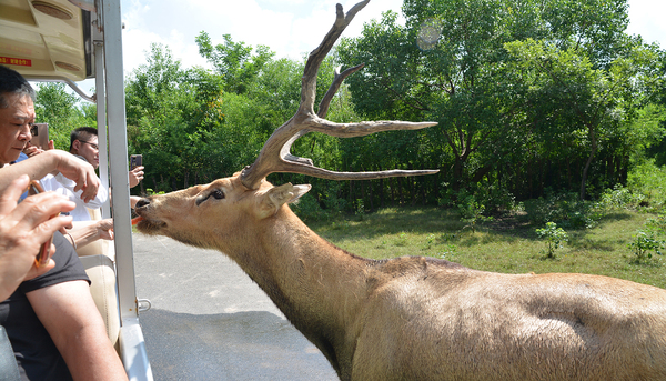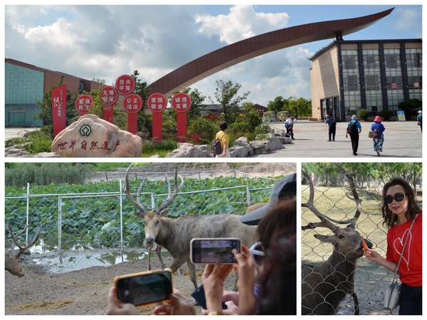 9月6日,早上參觀此行重點,大豐麋鹿國家級自然保護區,是世界面積最大的麋鹿保護區,景區內地形由林地、蘆蕩、草灘、沼澤地、鹽裸地組成。麋鹿其實就是“四不像”,區內擁有濕地7.8萬公傾,國際濕地沿海綠城江蘇鹽城市,地處太平洋西岸、大陸東部黃海之濱,683萬畝的沿海灘塗,兼具濕地、海洋、森林三大生態系統,被聯合國教科文組織評為世界自然遺產。麋鹿保護區最初從英國倫敦七家動物園引入39頭麋鹿,現在,數量已發展到7,033頭,繁殖率、存活率、年遞增率均居世界之首,保護區從1998年開始著手實施野生放歸,野外麋鹿數量已達到3,116頭。且建立世界面積最大的麋鹿保護區、世界最大的麋鹿野生種群及世界最大的麋鹿基因庫。