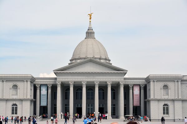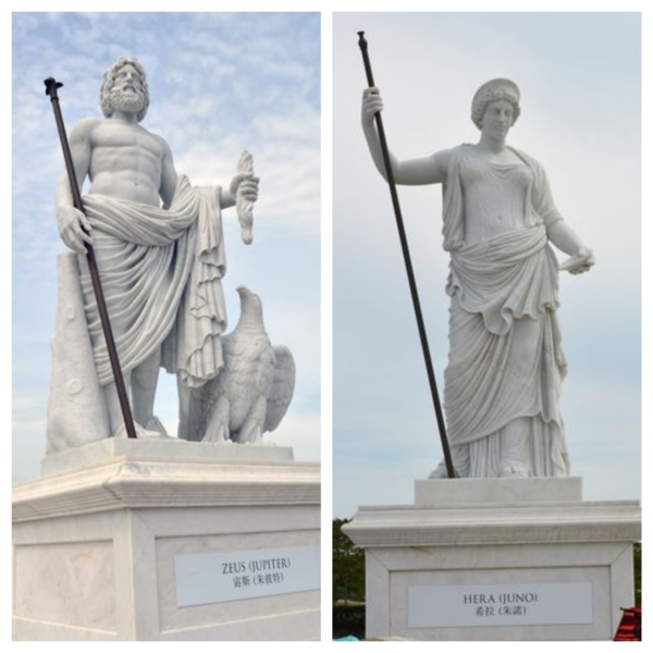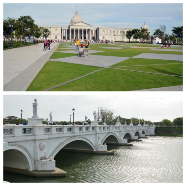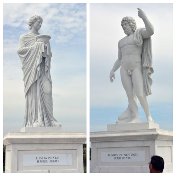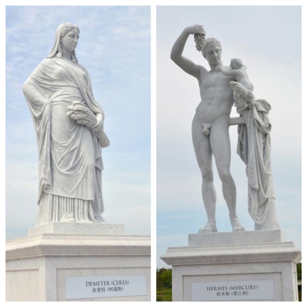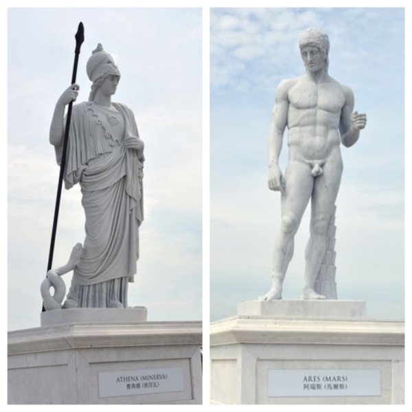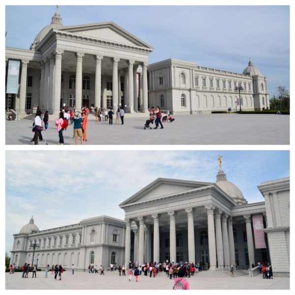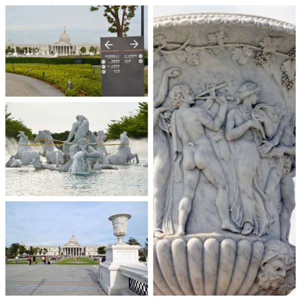 再說,我去歐洲欣賞的古希臘羅馬式建築,除了建築結構外,他們的美在石造的質感,在門廊、窗檯以及各角落的石雕,工藝之美及人文之美,有著更多古哲先賢、帝王爭戰、神祇的故事,這在奇美博物館的外觀看不到也缺乏,我們要摩仿也應該更多一點內容吧。在正廳上方的圓塔頂端有個【榮耀天使】,利用青銅打造一名天使手拿號角及桂冠,從天而降保佑這塊土地,我非建築出身,從很多角度觀看,其尖形與後方圓形之比例似乎不太協調,我無以名之。