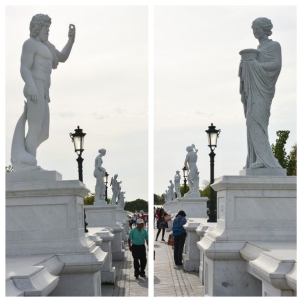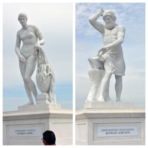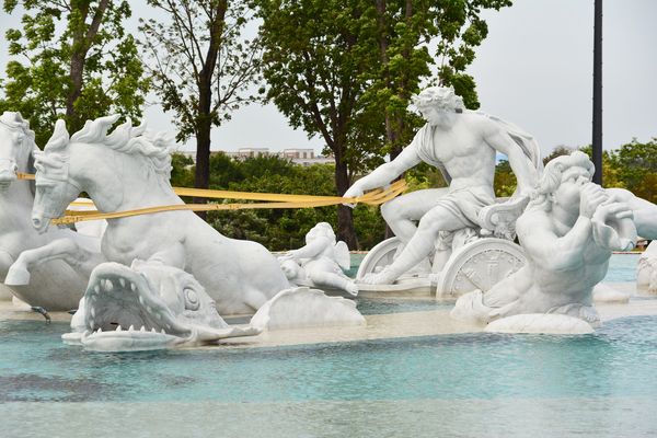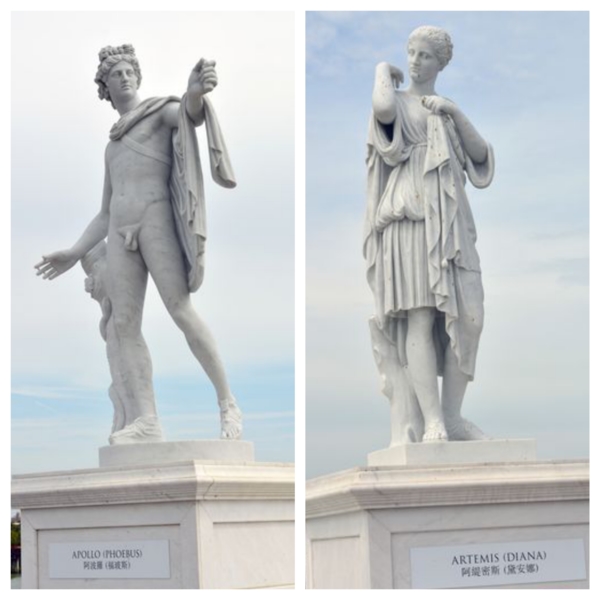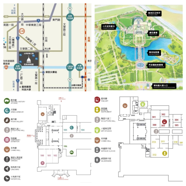 在進入園區入口大道後,首先看到的是奇美引以自豪的大理石群雕「阿波羅噴泉廣場」。這組群雕作品是館方委由法國藝術家裴路德(Gilles Perrault),以等比複製17世紀法國雕塑家圖比(Jean-Baptiste Tuby)於凡爾賽宮製作的阿波羅噴泉。穿越噴泉廣場後,走過矗立著12尊奧林帕斯神殿主神雕像的「奧林帕斯橋」,進入博物館前,在以神話故事中繆思女神為名的「繆思廣場」上,則可看見博物館圓頂上方由許文龍2008年臨摹自法國雕塑家巴里亞斯(Louis Ernest Barrias)的《信息女神》(這座被重新命名為《榮耀天使》的塑像,也是第23屆奇美藝術獎的獎座形象)。