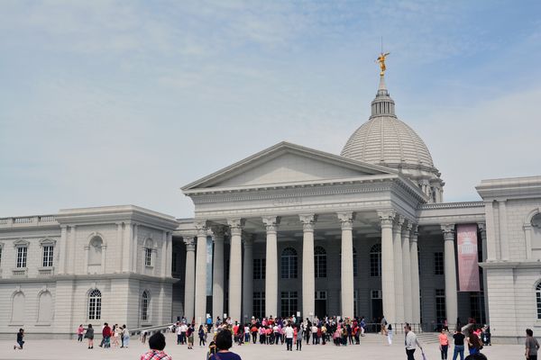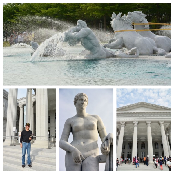 (二) 奇美博物館的建築,許文龍董事長非常欣賞希臘神殿的高聳挺拔,巨柱擎天的氣勢,也喜歡白宮式的圓頂,加上羅浮宮的成排建築與噴泉大廣場,他採組合式興建,成就了今天的奇美館氣派大門面。經典建築的宏偉絕美與方向實用,對他來說,遠比當代設計更為可靠。當有人要問,為什麼要耗費那麼龐大的人力、物力與財力,不找國際建築師設計一套真正奇美自己面貌的博物館?若懂得「許式美學」,他要為沒機會出國參訪「法國羅浮宮」、「美國華盛頓白宮」、「義大利羅馬萬神殿」等經典的鄉親,就近親炙。當唯一獲法國凡爾賽宮以「一比一比例授權」的阿波羅噴泉,在台南都會公園奔流迎賓時,那是留給台南人與訪賓直接的幽默與幸福感。這樣作法,確實引發些許批評,但若深入了解許文龍的整體思維,就見怪不怪了。許文龍選擇19世紀學院派的古典寫實繪畫、雕塑,展開收藏,另外複製經典造型建築,留給普羅大眾。因為這個時期的美,非常雅俗共賞,大家看得見、摸得著,甚至說,大家看得懂,有種平民式的理解與感動。讓地方鄉親在扶老攜幼中,省去舟車勞頓,一覽歐美式的藝術盛宴。