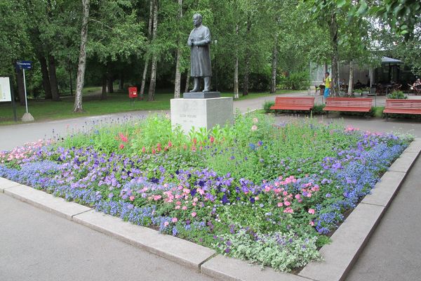 古斯塔夫‧維格蘭Gustav Vigeland的雕像,右手持槌左手握鑿的雕刻大師之尊屹立於公園入口右側,後方是奧斯陸政府為了讓維格蘭能夠專心公園的創作而蓋的工作室。