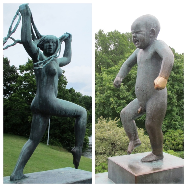 漫步公園,盡是赤裸裸一絲未掛的男女人體,沒有一點淫穢感,本來來自東方中國的我稍感不自在,有些怯怯的近距離站在裸體前,不敢注視欣賞,如此良久終於自慚形穢,在古代歐洲雕塑家崇尚人體美,裸體在這裡是被世人稱讚的。人物的身上不著衣物,一絲不掛顯示出人不論身分、地位,都是一樣的,沒有貧富貴賤,人生而平等。雕塑家用高尚的情操,唯美的觀點刻畫健壯體魄、發達的肌肉、比例勻稱、精神飽滿和臉部表情和諧的人物形象,這些表情生動、技法成熟的人體雕塑,對後世的影響非常深遠。