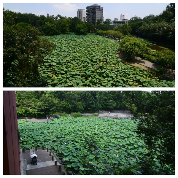 天亮很早,今年暑假出奇熱,沒想到熱浪襲人,回家才知道台北今天38.2度,已是史上第5高,難怪我繞著台北植物園荷花池,先用70-300mm鏡頭拍荷花特寫,圍繞池塘盡是攝影同好,腳架一排排,我看今日大太陽,連腳架也免了,信任我的雙手穩定度,一圈下來,已經是口乾舌燥、雙眼冒金花;再來一圈,換上16-28mm超廣角,快速拍完,我一向快槍俠,有攝影概念就好,並不在乎尖端品質、完美光線、講究的構圖。照完衝入歷史博物館,冷氣真涼,光是一樓的展覽,就讓我舒服又靜下心來—-偶陶畫戲-潮汕翁仔屏彩繪泥塑展,精彩又有水準的演出。看完已口渴萬分,趕到2樓的荷堂水月茶樓,點完餐及飲料,先喝了兩杯檸檬水,才留意有氣質的阿姨幫忙安排靠窗的座位真好,在冷氣房,居高臨下再欣賞廣角度的荷花池,讓身上汗水逐漸乾掉,好一個美的夏天啊!