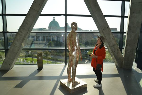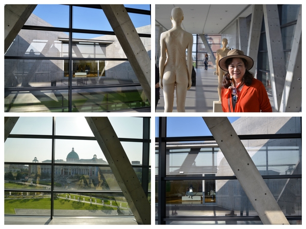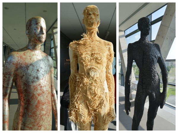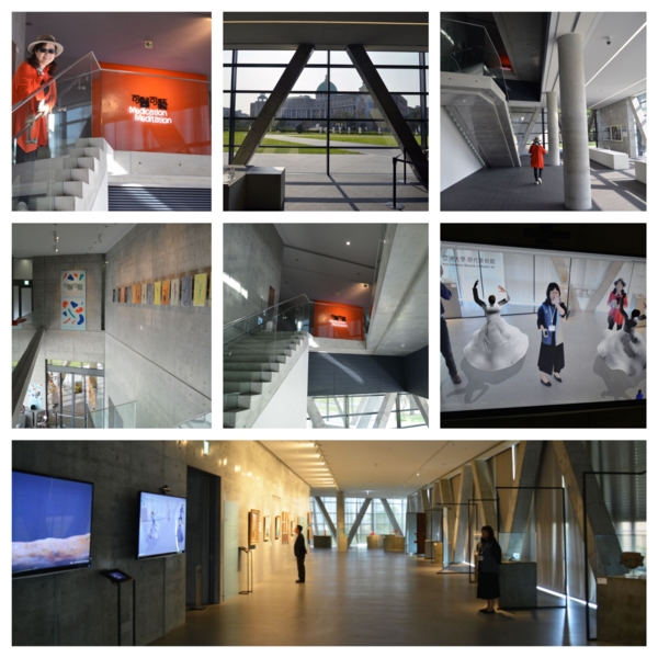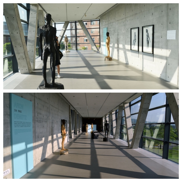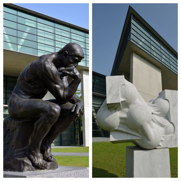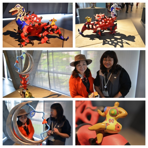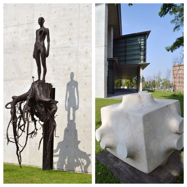 我們在美術館廣場及草坪徘徊良久,欣賞安藤傑出作品的外觀,前院草坪有幾個雕塑:法國雕塑家羅丹的「沉思者」、法國Niki de Saint Phalle妮基˙桑法勒的「海豚上的娜娜」、台灣楊英風「鳳凰來儀」、卡門‧塔涅弗「創世紀 II」、馬里歐‧洛佩斯「擴展的風景」、義大利Aron Demetz艾倫·德梅茲最新的「故土」等。說實在的,本來只安排了看完建築外觀就趕回台中市去看國美館2016雙年展,沒聽說有什麼展覽,沒想到進入參觀還有一系列的奇遇,讓我們驚喜連連,不但延遲回台中,還耽誤到天黑館方收場才依依不捨離開,主要是結緣了一位非常棒的義工陳敏玲小姐,她還熱心開車送我們回台中,一點都不覺得時間損失掉,簡直是收穫滿滿。
