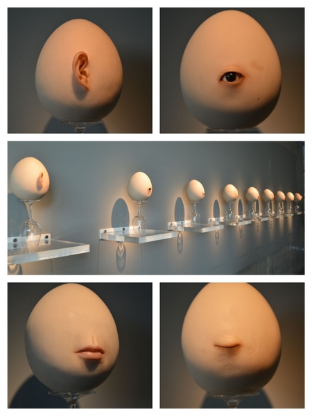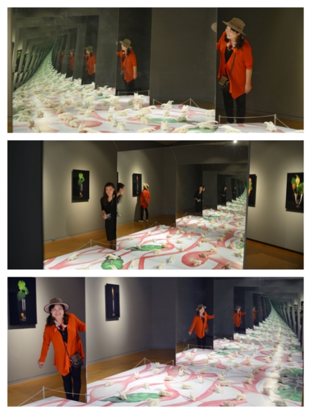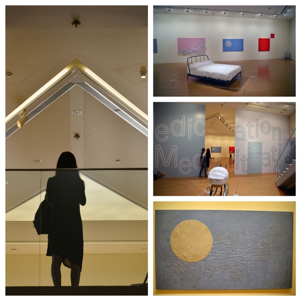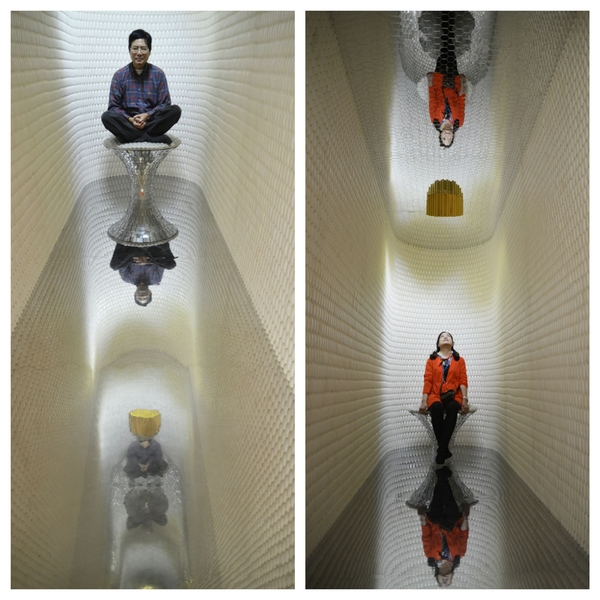 正在拍照時,剛好拍到一位黑衣小姐的背影,襯托著館展,一個不錯的畫面,後來陳小姐的解說吸引了她來聆聽,偶然交談,竟是一位來自上海建築事務所自由行的職員,意外的聽不出大陸腔,言談舉止不俗的田海貞小姐,服裝素雅大方,態度含蓄有氣質,自此我們投緣的、乖乖的聽著陳敏玲敘述導覽,在陳小姐的指導下,我們互相拍了一些美術館的熱點,「玩」得開心。最後下樓,一樓間有一小室,要不是陳小姐介紹,很容易就忽略過去了,小小題目叫「悟場En-Lightening」-----悟場存在於你進入、坐下的那一刻起。一次限一人,一次體驗限一分鐘,脫了鞋入內一密閉空間,盤腿在圓椅上,閉目冥想,燈光漸黑,聆聽聲音,宛若已經入定,燈光漸炫,而反射的鏡中,彷彿出現三個不同的自己,結合金工、雕塑與裝置藝術,創造出漂浮於半空中的球狀金屬,在空間中創造出結合光影的驚人氛圍。作者漂浮空中的作品,是以「不思議片刻」作品為起點,3個像蛹的現代物件,漂浮在老舊的木椅上,這是他與家人去道場靜坐時,突然領悟創作的。這是台灣藝術家董承濂Nick Dong的作品,他曾在台北明倫國中讀美術班,有可能是家內黃焉蓉的學生,其藝術工作室Studio-Dong在美國舊金山灣區,入選美國「40Under40」的裝置作品,我們照像會有另一光影意象效果,進入另一個境界。