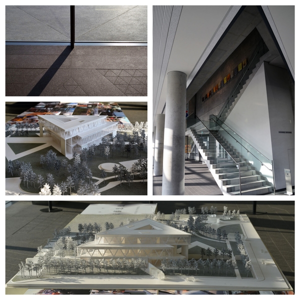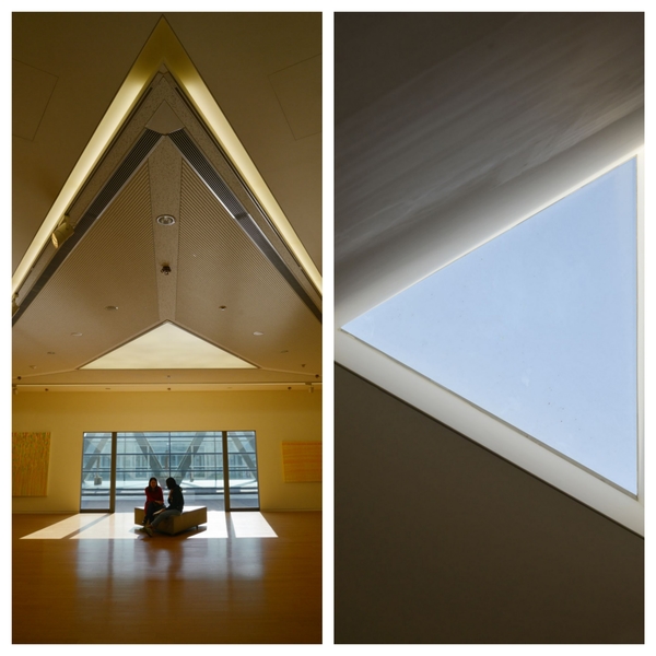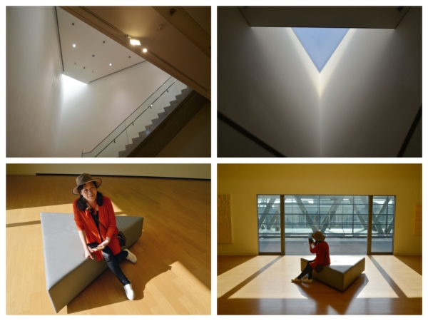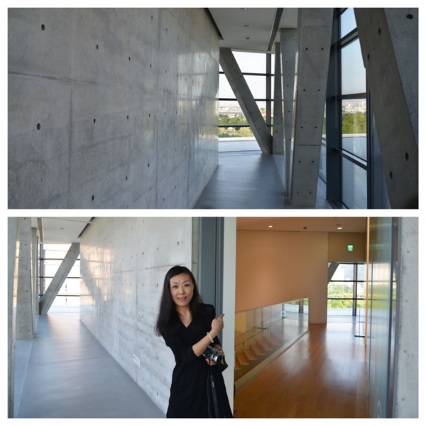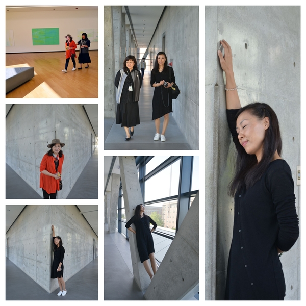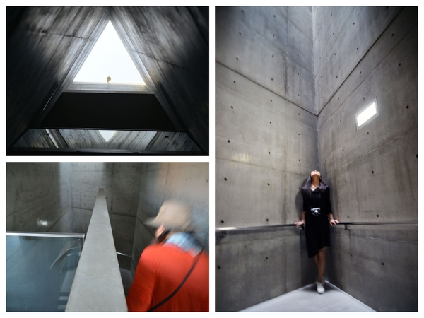 陳小姐帶領我們仔細觀賞伊藤的建築內觀細節,原來還有非常多的“眉眉嘎嘎”,無論是三角透視、清水模組水泥的質感秘訣、走道光源、轉角視線、轉角水泥的貼心小切面、頂層三角透光、V型廊柱、層層三角造形、新穎特殊的牆面掛勾孔洞、地板三角地磚線條與館外線條對準等等,日本伊藤的施工要求非常龜毛,幾乎令大家吃不消,在我們漫步館外館內,一經講解、一經體驗、一經觀視,才恍然發現那是多麼的不容易,一點一滴的累積製作,造就了現在的成果,比較國內所有的建築品質,不覺肅然起敬。對於一個私立學校,如此用心、如此有毅力、有眼光、有氣魄,為台灣打造國際級的建築,接著用心辦展,足以讓很多台灣有名的美術館及官員們汗顏了。創辦人蔡長海說:「十年的挑戰、等待與堅持,讓這棟以三個交錯疊置的三角形構成的三層樓建築,不僅成為震撼台灣建築與營造界的指標作品,更讓前來參訪的牛津、劍橋、哈佛、史丹佛、東京大學等世界名校的美術館、博物館館長都稱羨!打造一座安藤忠雄的完美建築,十年或許並不長,但期間經歷的「惡戰苦鬥」,將在這棟建築物的見證下,啟動台灣建築美學與營建水準的蛻變!」上網可以看到很多建築人的評論,我就不要班門弄斧了,看我鏡頭介紹吧。