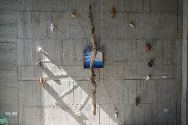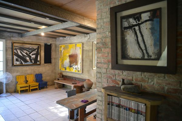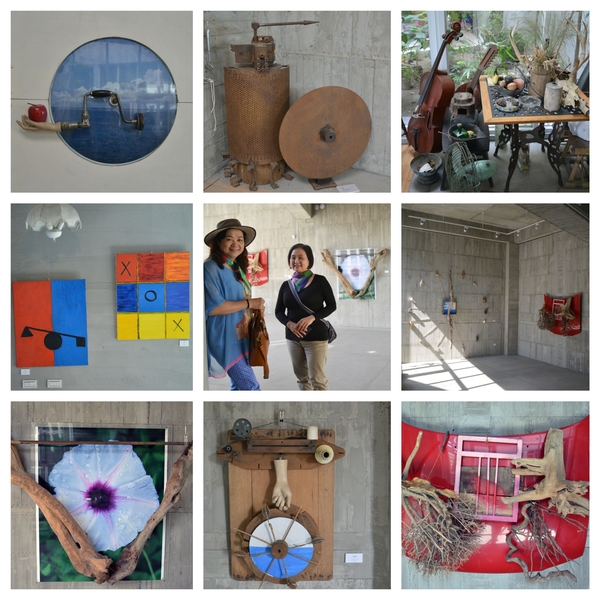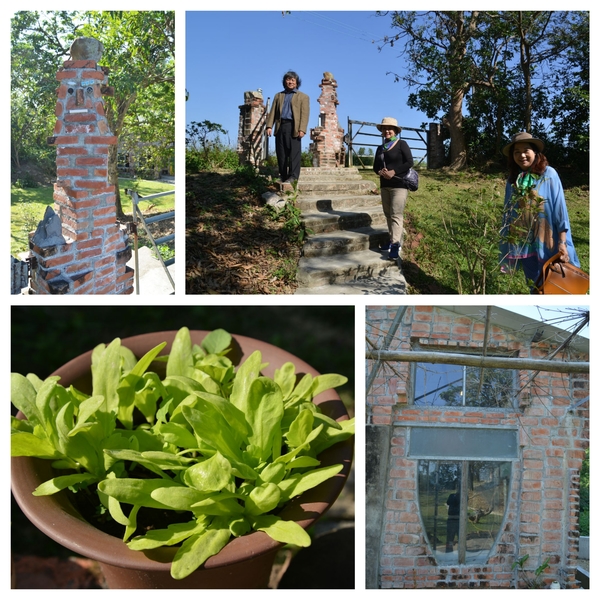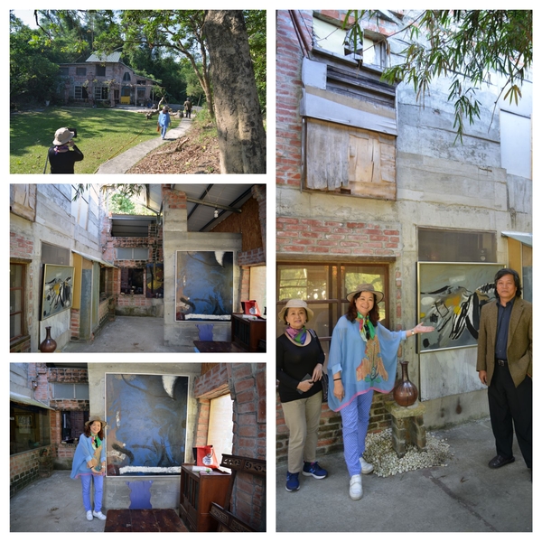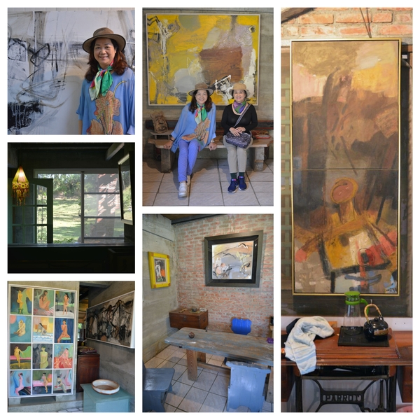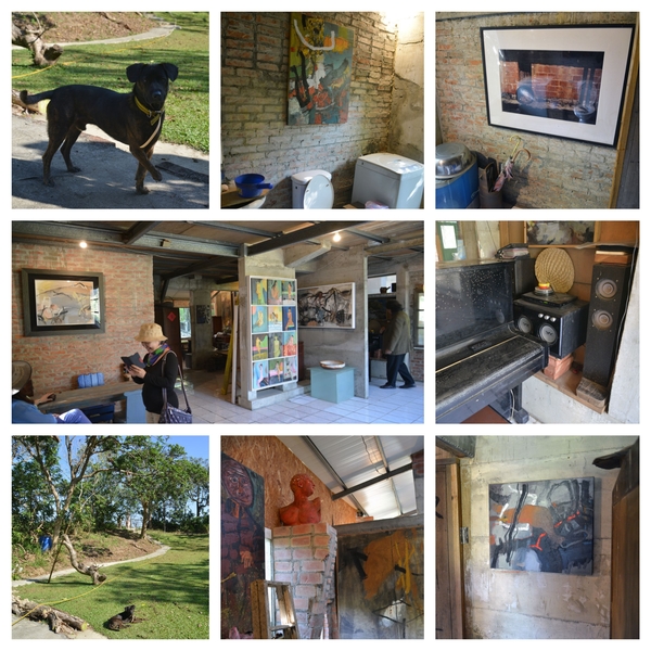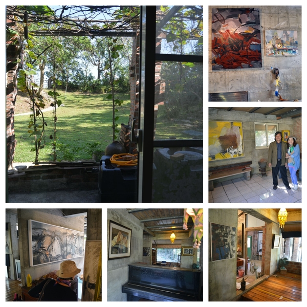 沒想到鄭宏章載我們在關廟區鄉間,東轉西轉,只見路旁種著鳳梨,田間只容一車的泥路,真怕對面也來一車,卻閃過一老翁騎腳踏車橫過,鄭宏章說那是他老爸,身體蠻健康的。原來這裡是他家祖產,他找了農地間畸零凹地,自號「木白草堂」,花了近八年時間整理,胼手胝足一磚一瓦都自己蓋,幾乎是他一個人,加上他太太來幫忙,建材多是撿來的,如有瑕疵的磁磚,不是流行的40X40或更大的,而是20X20小塊還有的已破裂,免費的廢棄物,還有木頭門、窗、紅磚,裸露的紅磚砌牆,長的鋼樑及柱則是夫妻扛上去的,景觀大玻璃怎麼架的我沒問,那可是又重又難的活,處處都有心血,處處都是人工做的,轉個角落都有趣,套句現在流行的話----手工的房屋(街上招牌手工餃子、手工饅頭)。聽他描述,房子經過颱風洗禮、幾次地震的考驗,都沒事,這個「農舍畫室」隱身鄉間田裡,真是在台北的畫家難以想像的,除了可能的蚊蟲等困擾,還令我們感到視覺身心都非常舒暢。