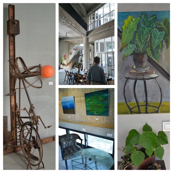 在洪政東精采的畫展中,來的賓客畫友好多,遇到台南大老馬芳渝大哥,他經營南方當代藝術聯盟不遺餘力,領導活力十足,每次都要督促勉勵我們一番。會中黃步青教授一聽說我們早上看了鄭宏章的工作室,趁午宴前,也熱心邀約去他的畫室一敘,不看則已,「黃步青80藝術空間」座落在巷弄中,地基約80坪,蓋滿了地基,只留一點中庭,三層樓加頂層,儼然是美術館的規模。外牆感覺像清水模組構造,在成大建築系任教的他表示,他自己設計,再找營造商建築,很多地方建商都覺得太難做了,想要省些事,還是他不厭其煩的督促,總算完成。37年次的黃步青,彰化鹿港人,法國巴黎大學造型藝術碩士,這個美術館比起其他藝術家,簡直是個天堂,有個自己專屬的美術館工作室,空間夠大,功能齊全,動線如自己意,無論那個藝術家都希望有天美夢成真。