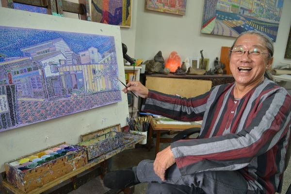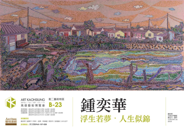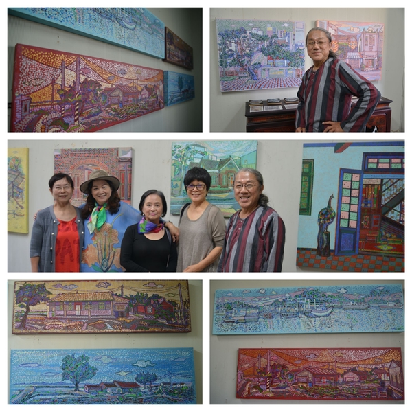 鍾奕華是我們藝專同學,他是緬甸僑生,畢業後隻身在台奮鬥,在台北民生東路開「北風畫廊」,幫台北的畫家裱畫裝框,也同時畫傳統繪畫,焉蓉有好幾年在他樓上租個工作室畫畫,大家相處的愉快。他兒子長大結婚搬到台南,不久他也結束台北的住家及工作室,毅然決然的搬到高雄美術館附近,靠近他太太黃慧鶯的娘家,隔了一陣子又搬到台南,總是無法抗拒含飴弄孫的衝動吧。以前的工作現在都交給兒子發展了,如今在台南忽然發現他的畫風改變,尋找類似秀拉點描法的自己風格,幾乎所有畫法都變成一宗,以台南古都老街風情,畫都市中的風景,也擅長將色彩理論套用到畫作當中,建立起鍾氏點描畫派,將大街小巷用自己的顏色和方式,展現出來,近來接受專業畫雜誌採訪,作為封面,我虧他說熬了好久要發了,他想要把以前的畫燒掉的話,就交給我保管好了,他終於笑開來了,還沒有人敢這樣跟他開玩笑,老同學就是口無遮攔嘛!
