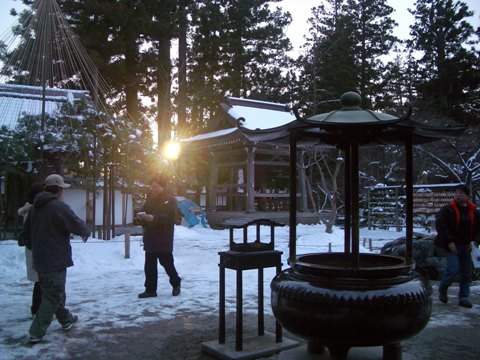走过长长的月見坂, 在时而轻薄, 时却沉农的雾里, 随着攀走而渐广的视野, 彷若慢慢地就卸下了灵魂背负的沉重........ 松尾芭蕉在平泉这儿想起了杜甫的诗..「国破れて山河あり、城春にして草木深し」, 感叹平泉往日的繁华, 湮没于人烟罕及的荒野...; 但我们每每造访此地, 却仅仅是为了....悼念生命中无法承受的哀伤......与自身以外的世界毫无瓜葛的自我哀怜, 但漫步到了供奉阿弥陀如来的本堂, 上了柱香, 无论是仲夏时, 在余晖幔落中,中尊寺依旧如其数百年来安静地持坐著....; 或者是冬末时, 在雪溶寒氛里, 若丝般自树影间穿射出的阳光, 似乎仍极欲温暖大地的萧瑟, 而在这里散发的静谧氛围里, 中尊寺仍宛若, 游客们往来不息, 红尘间一切生死皆与其毫无相关地安静蹴立著....