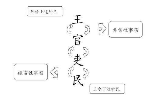 中國古代階級功能示意圖:「王」、「官」、「吏」、「民」