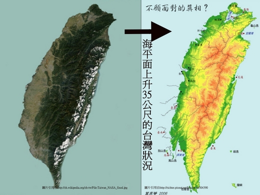 彗星撞地球,從前人們認為不可能,現在人們知道不是不可能,只是時間的問題。海水上漲,從前人們也認為不可能,現在知道海平面上升35公尺是可能的事,只是不知道何時發生而已。從現在的台灣地圖對比海平面上升35公尺後的台灣地圖,很明顯看到台灣縮水了,台北盆地又變成台北湖了,知道它會發生,只是不知道何時會發生,但它一定會發生,那麼我們將如何面對縮水後的台灣?又如何在縮水後的台灣上永續生存?這將是我們這一代人對後代子孫的一個交代。