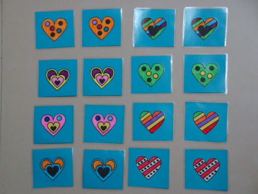 製作方法:將兩組相同愛心塗上相同顏色後,貼在裁好的紙卡上護貝就行了