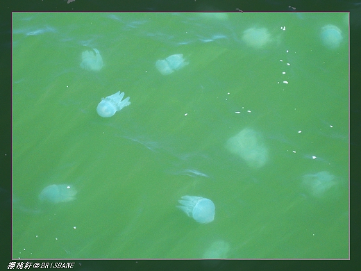 這次,在布里斯本的REDCLIFF,又看見在豔陽下成群結隊浮在海面上曬太陽的大批淺藍水母,這兒的藍水母既不像雪梨情人港邊的水母透明迷你,也不似柏斯獨來獨往的大水母,體型介於兩者之間。藍藍的水母輕巧的浮游在水面上,看起來一樣好看……在夏天午後,好像恣意的、懶洋洋的曬太陽,而行人,只能從橋上往下望,欣賞牠們數大是美的慵懶舞姿。