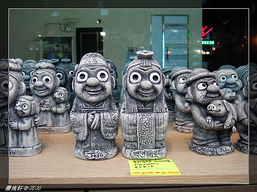 濟州島上的土地公都是用石頭雕刻而成的,造型高大,時常左右兩尊土地公鎮守路口或大門入口,隨處可見,只是兩尊都是土地公,沒有土地婆(不知為何,重男輕女嗎?)。除此之外,各種瓶子容器、巧克力、牛奶包裝盒、垃圾桶、電話亭子、電梯圖案……等等,到處都是土地公造型,連各種攤販販售的紀念品也必定有火山岩塊雕刻的各種土地公造型的紀念品(小雕刻、手機吊飾等)。只是很奇怪,大馬路邊的土地公都是男性的土地公,即使是兩邊陳列,也沒有土地婆,但是販售的小飾品雕刻物卻幫土地公配了土地婆了!(上圖)