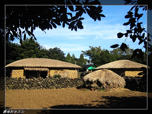 - 城邑民俗村:「 【城邑民俗村】這裡現有 400 餘棟宅屋,被指定為韓國的民俗資料保護區,以茅草覆蓋的屋頂,石頭疊砌的院牆以及用架木取代門戶的民宅,質樸可愛,至今仍有人在這裡居住生活。 」民俗村內有專人中文講解濟州島民以前的生活方式,以及男尊女卑的社會型態。例如男女生特有的稱呼(同巴利、能巴利等)、女人的挑水缸(怨氣缸)、男嬰的搖籃(女嬰隨便睡,但說男嬰因此被搖笨了,但不會暈車船)、以前上廁所的方式、牲畜豢養方式(黑豬吃人糞)等。末了就是生蜂蜜和五味子茶介紹。這位講解的大姊說嫁到民俗村內的婦女都得義務擔任每週一到兩次的解說員,福利是子女可以免費就讀到高三。