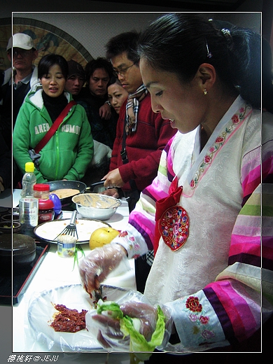 下圖二:泡菜館的老師講解泡菜製作的過程。我看有的旅行團是團員自己可以DIY的,我們這團只有圍著看而已。泡菜好吃,但是泡菜煎餅不怎麼樣呢。