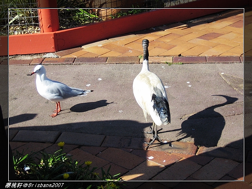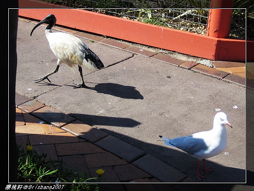 到了布里斯本,看到另一種也很幸福悠閒的大塊頭,體型比海鷗和鴿子龐大,一樣會飛、會爭食人類食物的鳥類——ibis(鷺)。如果不是牠那長而尖彎的特殊鳥喙,我真覺得那是隻長腳山雞呢。
