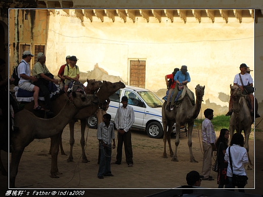 印度之旅,有騎乘駱駝的行程,通常是兩人騎一頭,有一駝伕牽著駱駝,高大的駱駝會蹲下,讓觀光客便於登上駝峰(看起來都是單峰駱駝)。