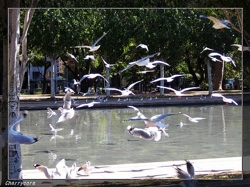 海德公園裡方形的大回顧池( Pool of Reflection )兩側草地上有許多覓食的海鷗和鴿子,當時我的相機鏡頭正瞄準回顧池裡兩隻像鴨子般浮在水面上悠遊的海鷗時,不知為何,突然有一大群鳥類從我背後飛來,剎時我的鏡頭裡滿是飛舞的鳥,我顧不得調整相機距離,馬上按下快門,拍下了這一張「漫天飛舞的鳥照」,這種機會真是可遇不可求啊! (待續)