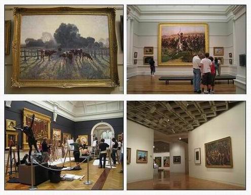 地面樓的展覽主要是十九世紀歐洲與澳洲的作品和二十世紀澳洲的美術作品展,有許多名家的畫作(但我幾乎都不認識)。導覽書上介紹一幅必看的畫作是 Elioth Grunner 獲得 1919 年澳洲懷恩獎( Wynne ,澳洲三項美術大獎之一的風景畫獎)的作品「春天的霜凍」,我雖不懂得藝術,但看這幅畫作的乳牛不但栩栩如生,而且光憑作者在近百年前竟能用畫筆畫出光線穿透樹林投射在牛隻身上和草地上這一點,我想這幅畫果然是實至名歸的得獎畫作!另有一巨幅畫作描繪驍勇善戰的法王萬歲( Vive l’Empereur 1891/93 ),對照旁邊的觀者更顯雄偉。另有一區裡還有成群的學生在現場素描,裸露上半身的男模特兒以獨特的姿勢坐在中間,讓圍繞著他的素描者從各個角度作畫。