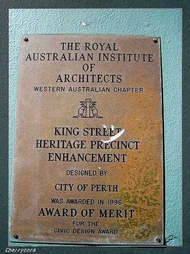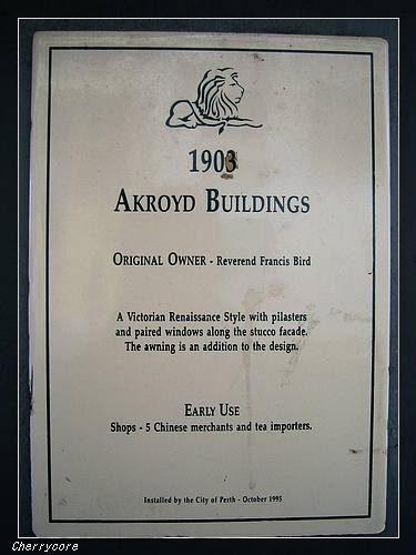 這類維多利亞式建築歷史悠久,許多建築會在正面的樓面刻上建築年代,讓人藉由數字推算建物年紀。在柏斯的市區King Street和Fremental,我還偶然發現有的建築物外牆貼有建築物的識別標示或說明,例如King Street有一棟是1903年的Akroyd Builidings,說明原始擁有者和修繕情況,有一棟建築還獲皇家建築師協會頒發古蹟維護良好的獎項;而Fremantal這一棟建築則說明歷史起自1873年,1912年由當時的總督宣布開放。