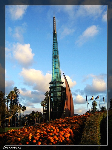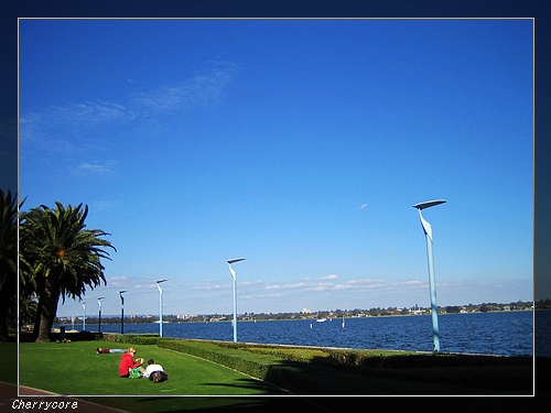 有天週日午後到天鵝河邊散步時,岸邊的綠草地、海天一色的碧藍天,南半球的四月天暖洋洋的,人們自在的騎車或閒逛。下午兩點十分,Swan Bell傳來鏗鏗鐺鐺的鐘響,我已經走遠了半小時的距離,仍然隱約聽到鐘聲隨風飄盪過來。就像上百個音樂鈴齊鳴的聲響,隨著暖風陣陣襲來,著實令人陶醉!
