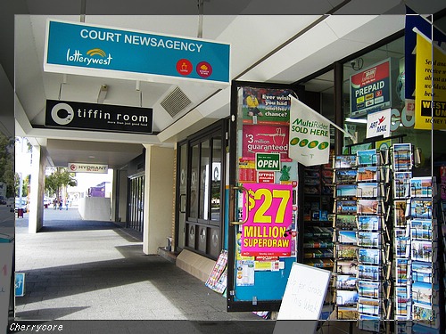 我在柏斯的HAY ST一條街上閒晃,就拍到三家NEWSAGENCY(兩家有賣西澳樂透),只是大小規模不太一樣,最靠近市中心的這一家新聞代理店的門口還設有樂透銷售點,裡頭還有飲料櫃,十幾種報紙一疊疊攤在地上,就是沒有中文報紙;時尚雜誌仍是靠美女封面招攬顧客,而且就擺在入口處。各類型雜誌分門別類擺在架子上,看起來柏斯的新聞雜誌業很興盛吧!