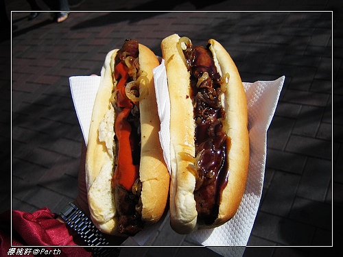 在柏斯的Murray Street市中心,那天我和Ming在上班日短暫的中午休息時分打算快步到市中心超市採買食物回公寓烹調,但是時間實在有限,卻在飢腸轆轆之際,第一次在澳洲看到了「路邊攤」(不過忘記拍照了)。這是個迷你的小攤販,賣的是最方便快速的速食—香腸熱狗麵包。攤販老闆看起來是中東人,小攤子上正烤著香腸和熱狗,有點像臺灣的香腸攤,但少了骰子落在碗公上的響亮聲。於是,我們決定以此裹腹,免去中午還得速速烹調加狼吞虎嚥的窘境。