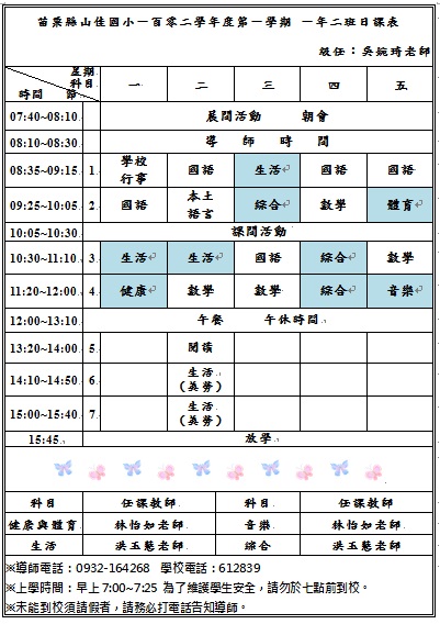 一年級上學期日課表
