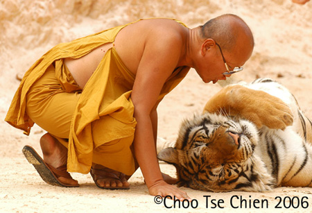 虎廟僧人養老虎,讓人不由得讚嘆全世界最神奇的人種就是和尚與尼姑。一般和尚沒什麼錢、沒什麼官位、甚至有的根本沒有唸過書,但是只要佛心修得好,就能影響社會、感化人心,有時甚至政治領袖都會乖乖聽他們的話;而虎廟的和尚,則是徹底感化老虎猛獸心,由於早期經費缺乏,和尚買不起肉,因此只好省錢買貓乾糧來餵老虎,而這些老虎在僧人面前也的確乖得跟貓一樣,會任由和尚幫牠們洗澡、把牠們當狗遛、甚至還會聽佛經。