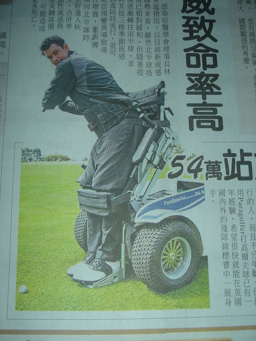Paragolfer是一款特製的輔助站立電動車,要價一萬英鎊(約五十四萬台幣),可以幫助杭特這樣的人維持直立姿勢,站著打高爾夫球。它的電力可以撐完三十六洞,行駛里程約三十四.六公里。它配置的兩具高性能馬達可以帶著選手穿過沙坑,最高可以爬越三十度的坡道,特製的輪子在球場行進時也不會破壞草地。