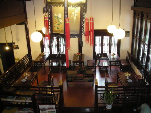 不隨團的我,隨機跟上地陪,聽解說瞻園的背景。也許是偷聽,我的記憶力超速翻轉,小時後總惱背書,原來是心不願,在這園內氣氛散漫、古樸老屋角落午餐的我,是這麼想。而那頓有些拖沓的午餐,與其說,是一頓極度美味的風味餐,還不如說,是飲儘自由、悠閒與愉悅甘霖。那些來自湖南、四川小女孩(服務生)溫馨可人樣兒,為我添加遁世氛圍。更讓我驚豔的是,懸掛浴廉的門後儘是這般…一根廊柱、一把階梯、一個回廊、一座塔樓、一位旅者…。我發現文化與藝術的驚喜與精緻、寬敞與古樸,恰似對準我的神經胃蕾,那份好心情,至今仍能回溫。我賴著不想要離去,在二小時半後,這是獨行者獨有特權。