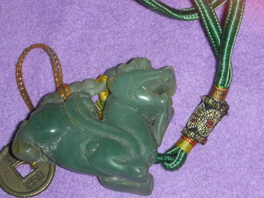 意料之外,本以為參觀鍾山主要景點『中山陵、明孝陵』之後,才會強迫購物,但那車已徑駛入(果然在山背上)購物區。這座不算大的建築物內,擺滿各式大小不一磇貅,有玉器、有瑪瑙…。穿制服服務生客氣招呼我,這次沒有讓我喪失抗禦能力,笑咪咪的服務生臉孔開始轉沉,計程車司機開始不奈,而我總是輕鬆、溫和耗著,這是多年獨自旅行,養成處理危機與整理情緒的EQ。鐵青臉的服務員,以半恐嚇的說:『那有人將財神爺敢出門[1]』生氣離去,我掉個頭買下,進門就看中質材絢麗瑪瑙製的磇貅。
