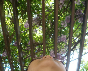 台大農場門口,紫藤纏繞著苦楝,一大堆欣賞紫藤的人,不禁感嘆。仰望,見苦楝直挺挺的撐起一片陽光,紫藤依附它,好緊好緊,藤蔓延著苦楝的軀幹,慢慢向上攀旋,這份愛,彷彿窒命的吸引力,讓苦楝無法呼吸。為情所困的真實面貌,紫藤一點兒也不覺得自己必須負責,誰叫,苦楝緊緊跟隨,誰叫,苦楝痴心奉獻。