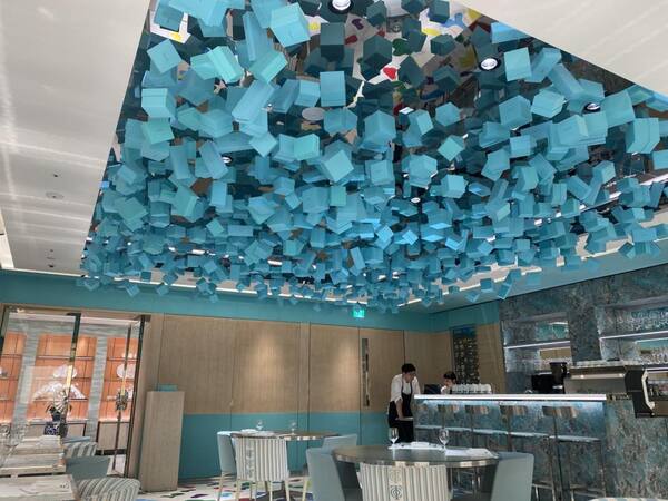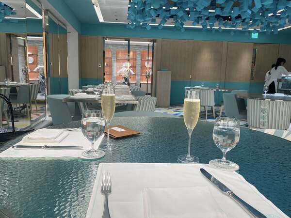 有人收到某百貨公司贈送的兩人份餐卷,找我共享。於是晚上很少出門的我去到不熟的信義A9。我倆在狹長的賣場頭尾走一遭,硬是找不到”BLUE BOX CAFE “,問同樓層櫃姐她們也不知道。摸排一會兒才發現原來它附屬在珠寶店Tiffany 裡面,要從Tiffany 大門走進去。