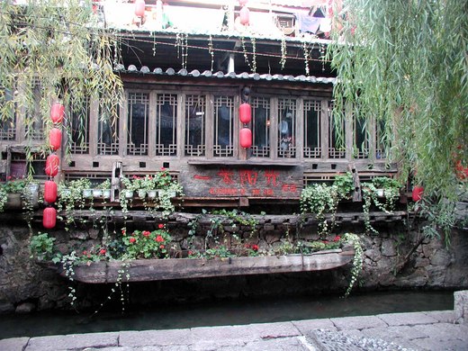 雪山的冰雪融化後,流入古城,把小城一分為三,溪旁林立起小店,溪上架起木板,通向緊緊相偎的小館、酒廊、藝品店、畫廊、銀飾店,令人錯覺置身威尼斯。然而威尼斯哪有這樣的東方情調呢?工作坊裡的年輕藝術家在木頭上烙畫,玻璃球裡畫畫,米上刻字,木門上雕琢出鳳凰百獸。店名都挺詩意的:「薄荷藍」、「一米陽光」、「地平線」,一溜溜紅燈龍、一串串黃玉米,還有溪邊船形的迷你花圃,盛滿了鮮花,在冬日的暖陽下,搖曳。